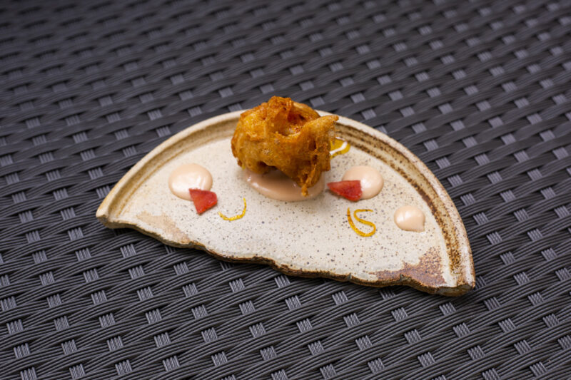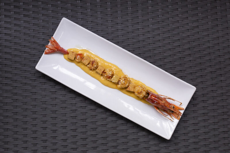 Para el gambón en tempura de texturas: retirar cáscara. Triturar el panko y los kikos y mezclar con harina.