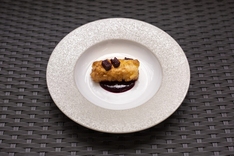 Para el coulis de granada: pelar la granada, quitándole lo blanco y ponerla al fuego con agua y azúcar. Cuando hierva retirar del fuego y triturar.